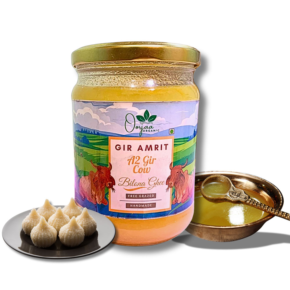 Our A2 Gir Cow Bilona Ghee is made from the curd of purebred, free-grazing Gir cows using the traditional Bilona method, ensuring rich A2 protein, better digestion, and immunity. It’s 100% natural, free from additives or preservatives, and packed in eco-friendly glass jars. With its golden color, grainy texture, and authentic aroma, each spoonful reflects purity, tradition, and wellness. FSSAI-certified and lab-tested for quality — a true superfood delivered to your doorstep.